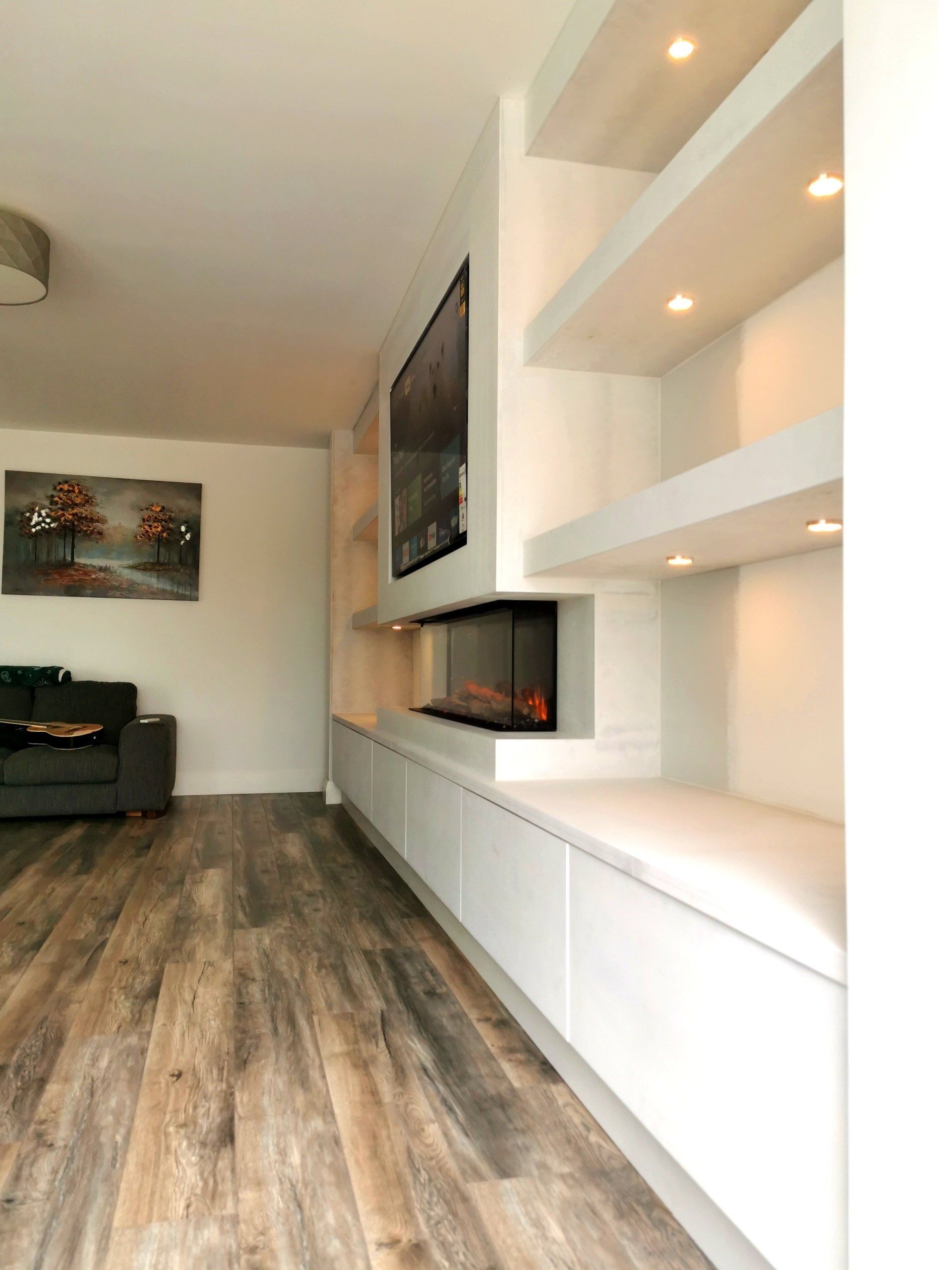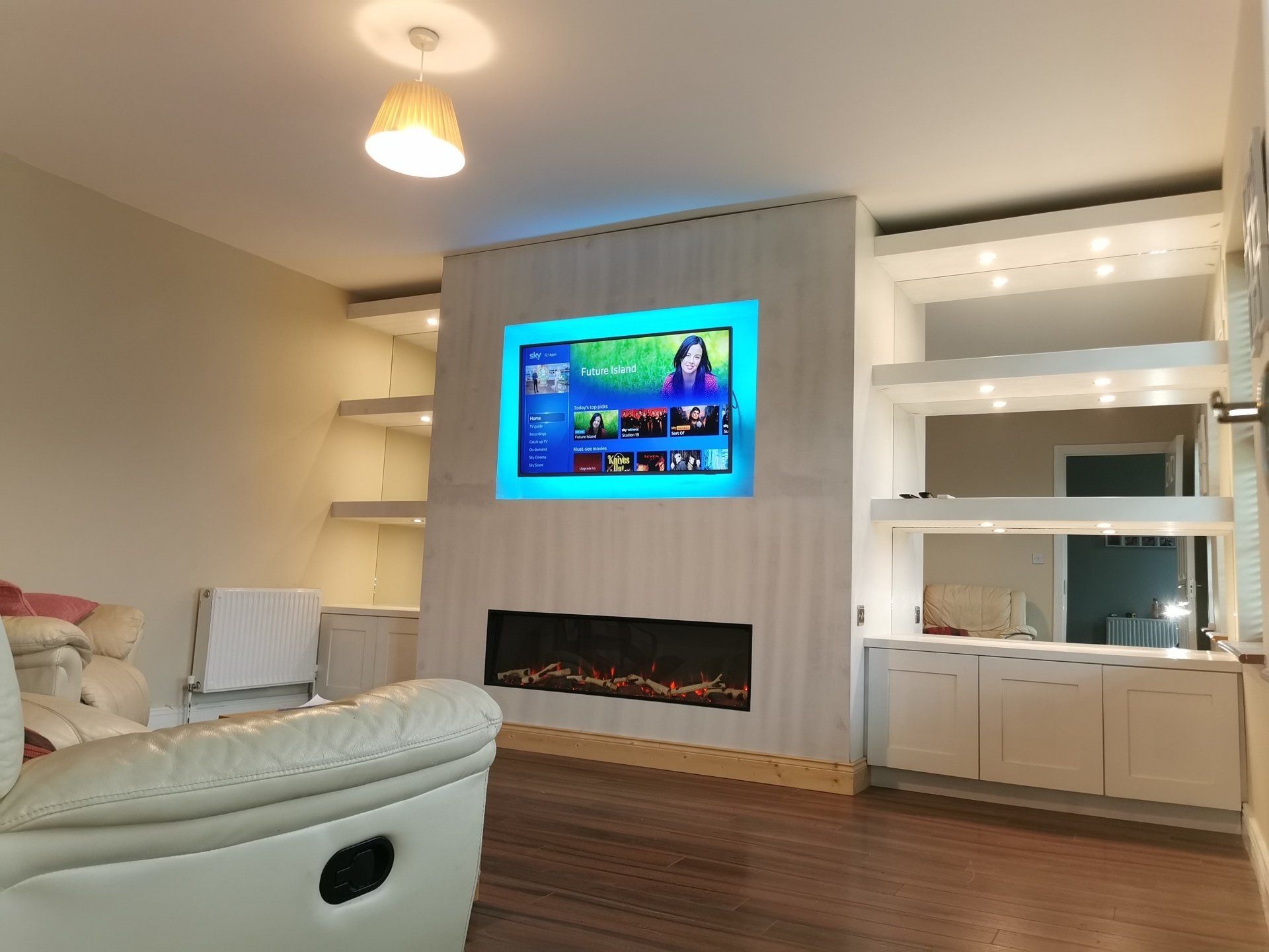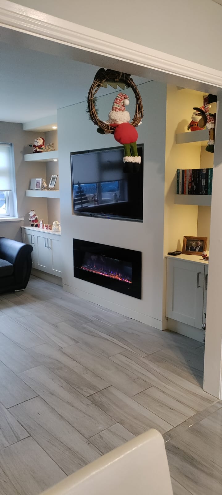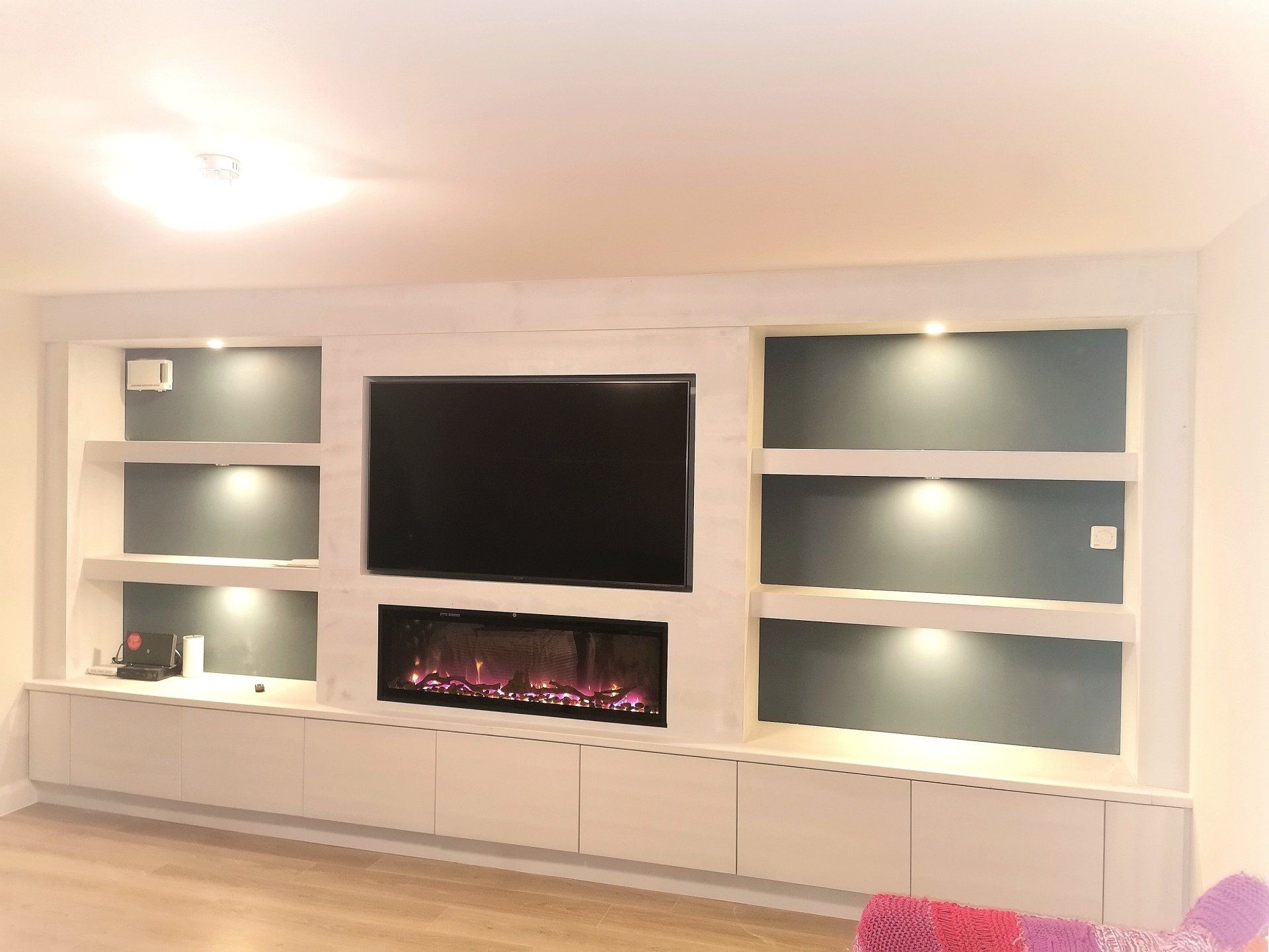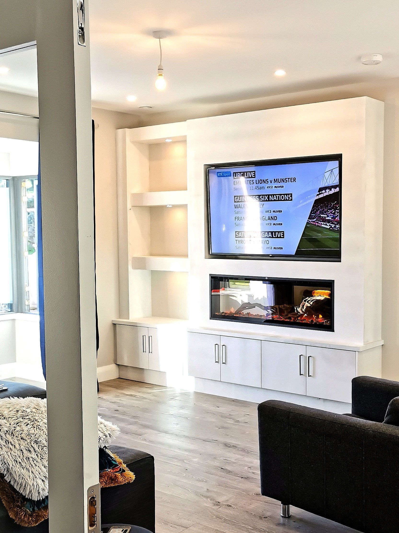 Our team is comprised of Skilled Carpenters, Registered Electrical Contractors, Dry Lining Professionals and Experienced Plasterers. We can help give you exactly what you're looking for when constructing the feature walls that match your design. For example, If you want cabinets, led lights, a sunken or stepped fire, and a big or small tv, shelving, built in presses or even features for ceilings. We can do it all for you with qualified tradesmen.